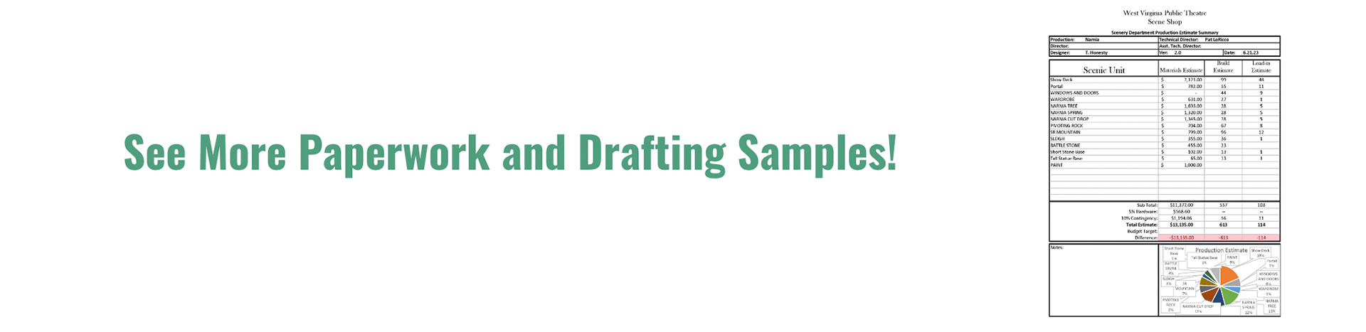 After the two summer shows were wrapping up, I also had the opportunity to assist in the budgeting and drafting for NARNIA THE MUSICAL, opening in December 2023. I worked closely with the Director and Scenic Designer to develop a working budget for the show and created a comprehensive package of working drawings for the production.